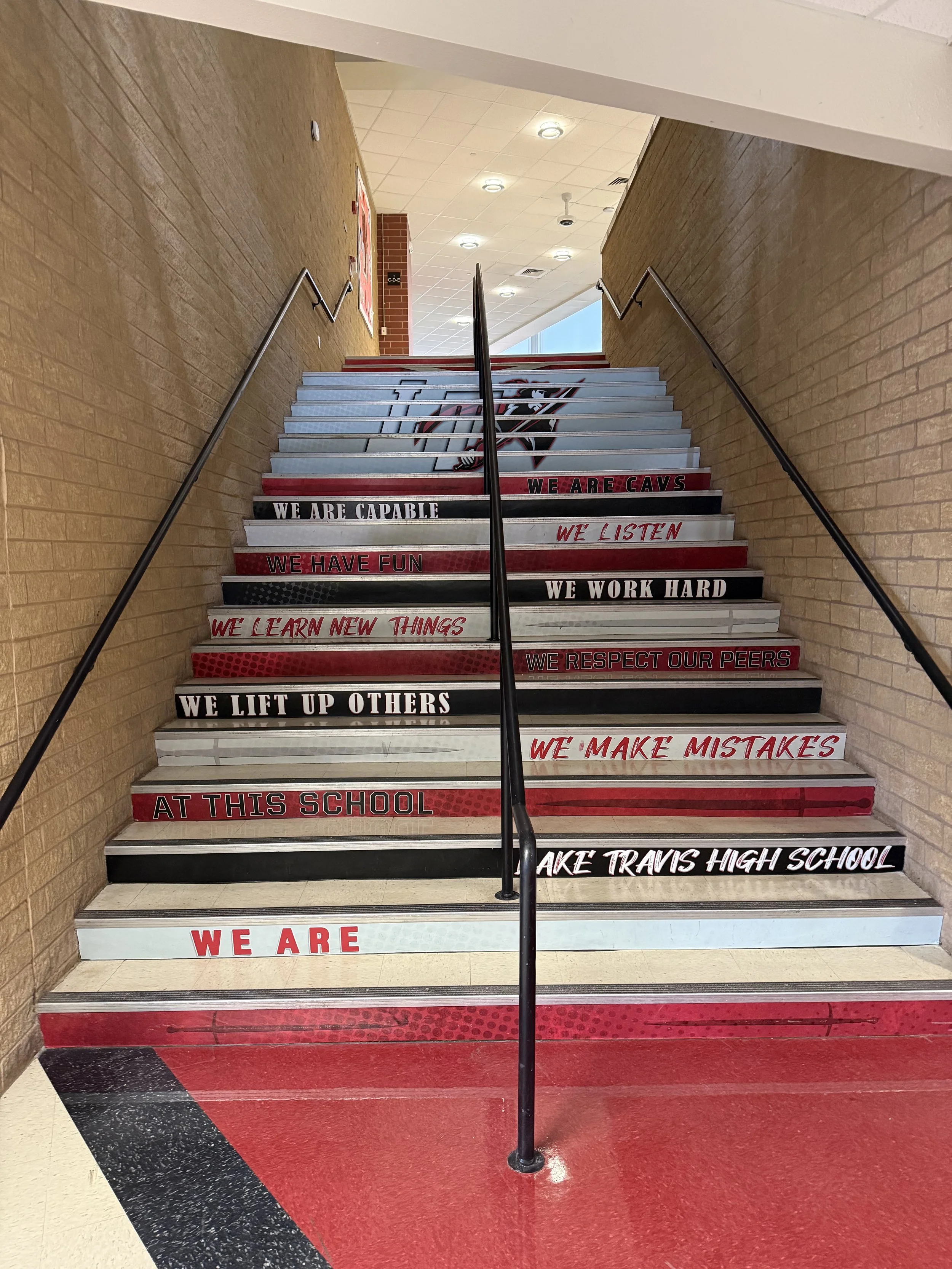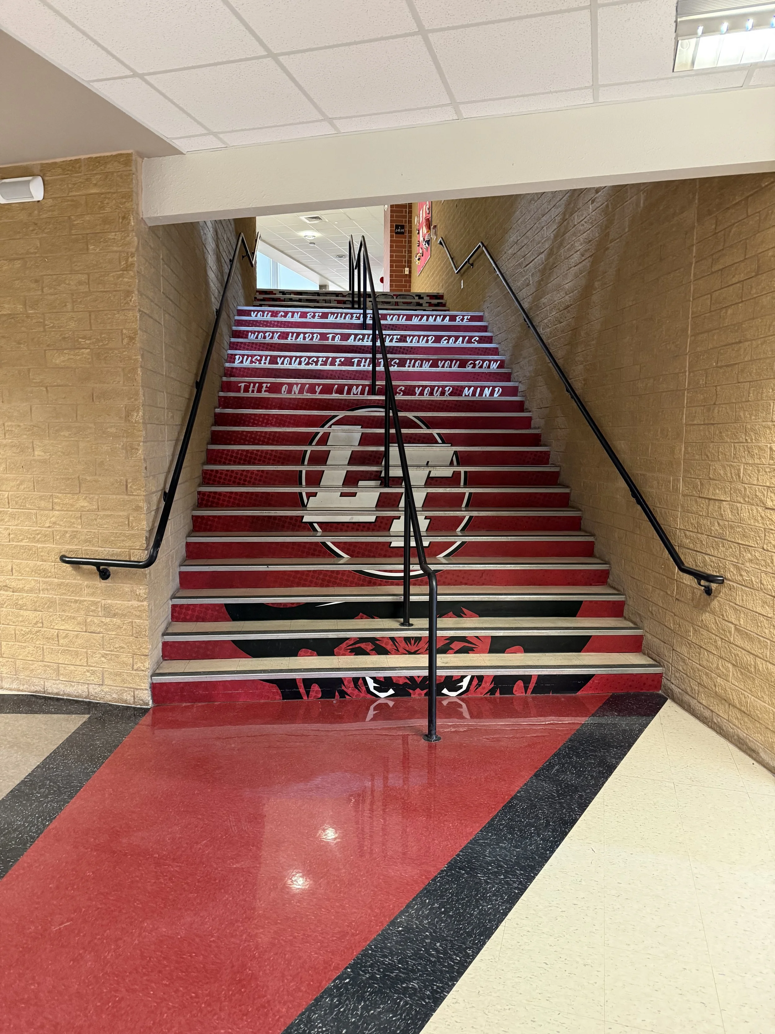 Staircase in Lake Travis High School, displaying their logo and other encouraging messages.
