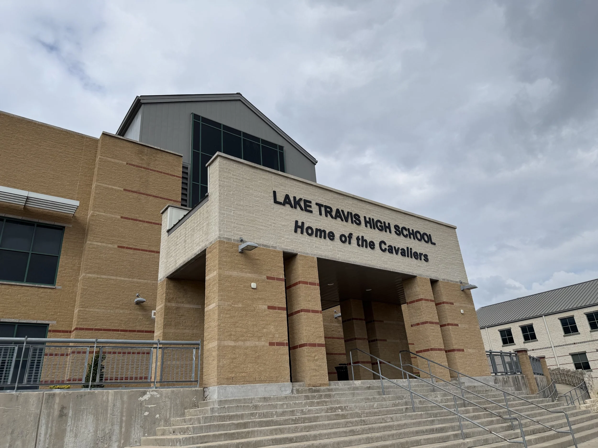The front entrance of Lake Travis High School, the school district where Dr. Bethany Medford and Dr. Null work.